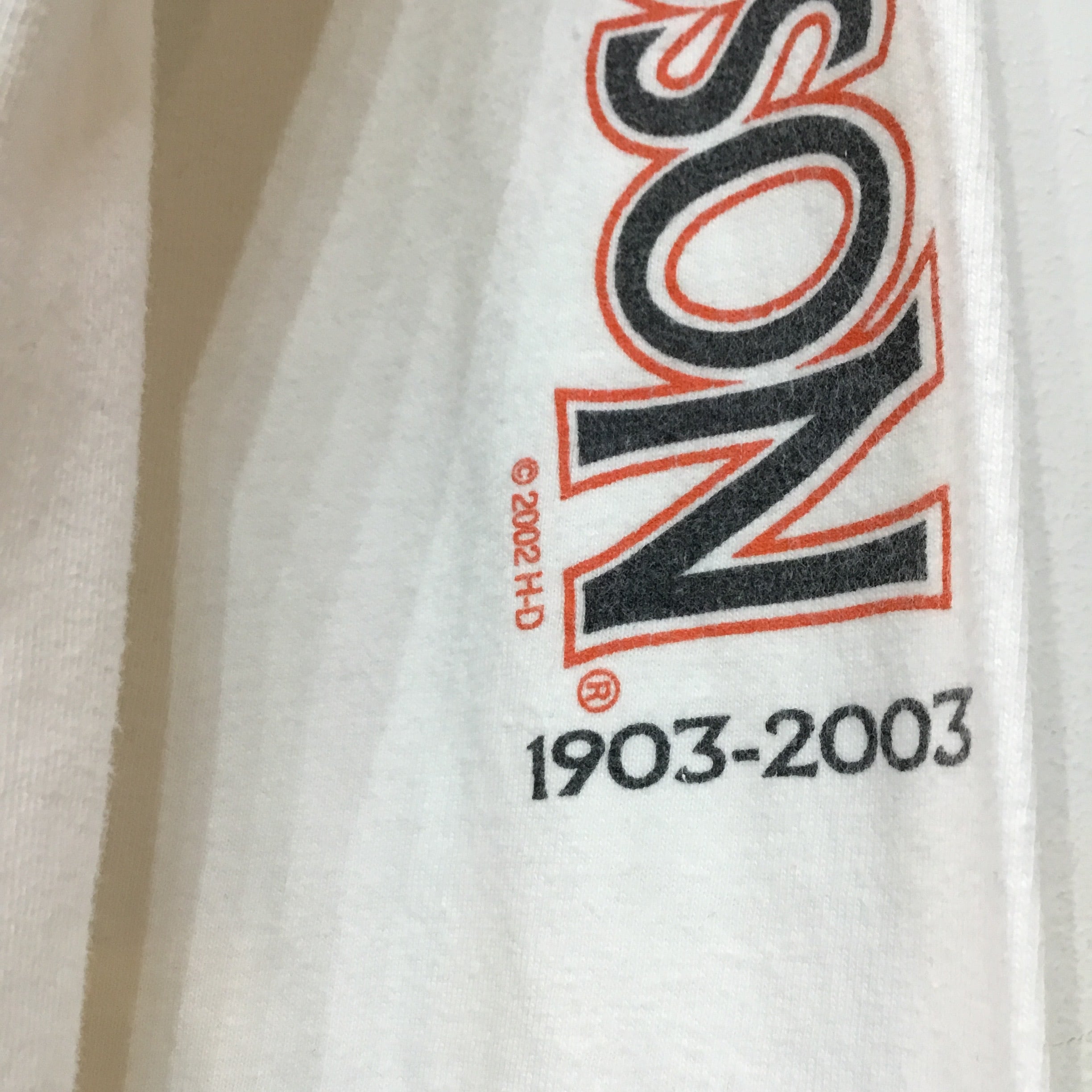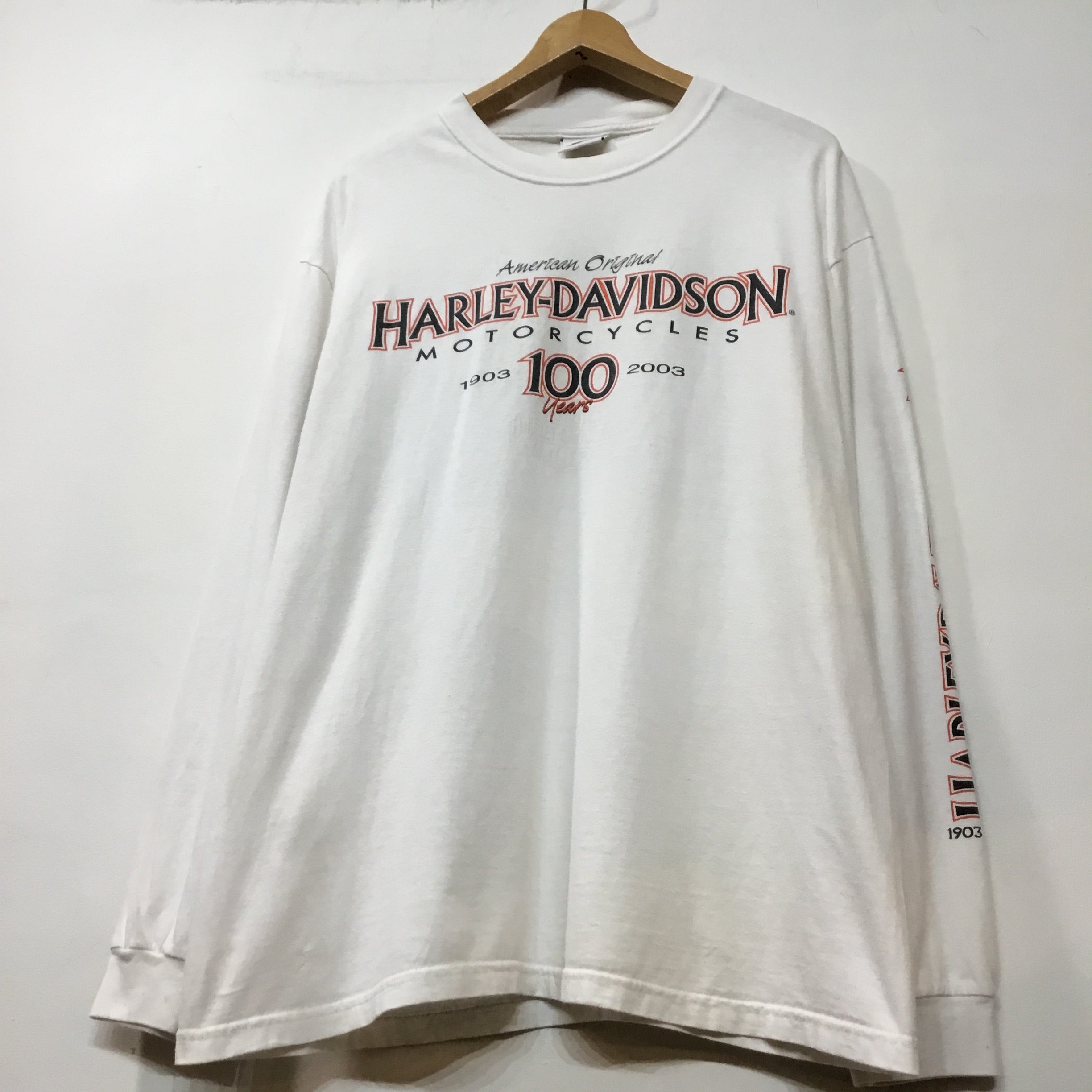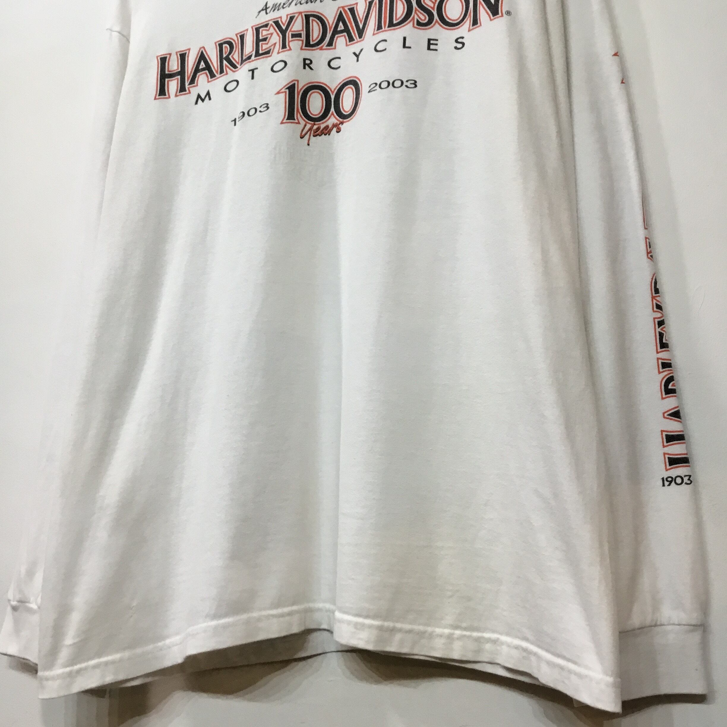 ‘03 USA製 Harley-Davidson ハーレーダビッドソン 長袖Tシャツ 白Tシャツ 袖プリント ロンT バイク 両面プリント ハーレーT バイクT バイカーT 古着 【25AWNT】 gr-1163