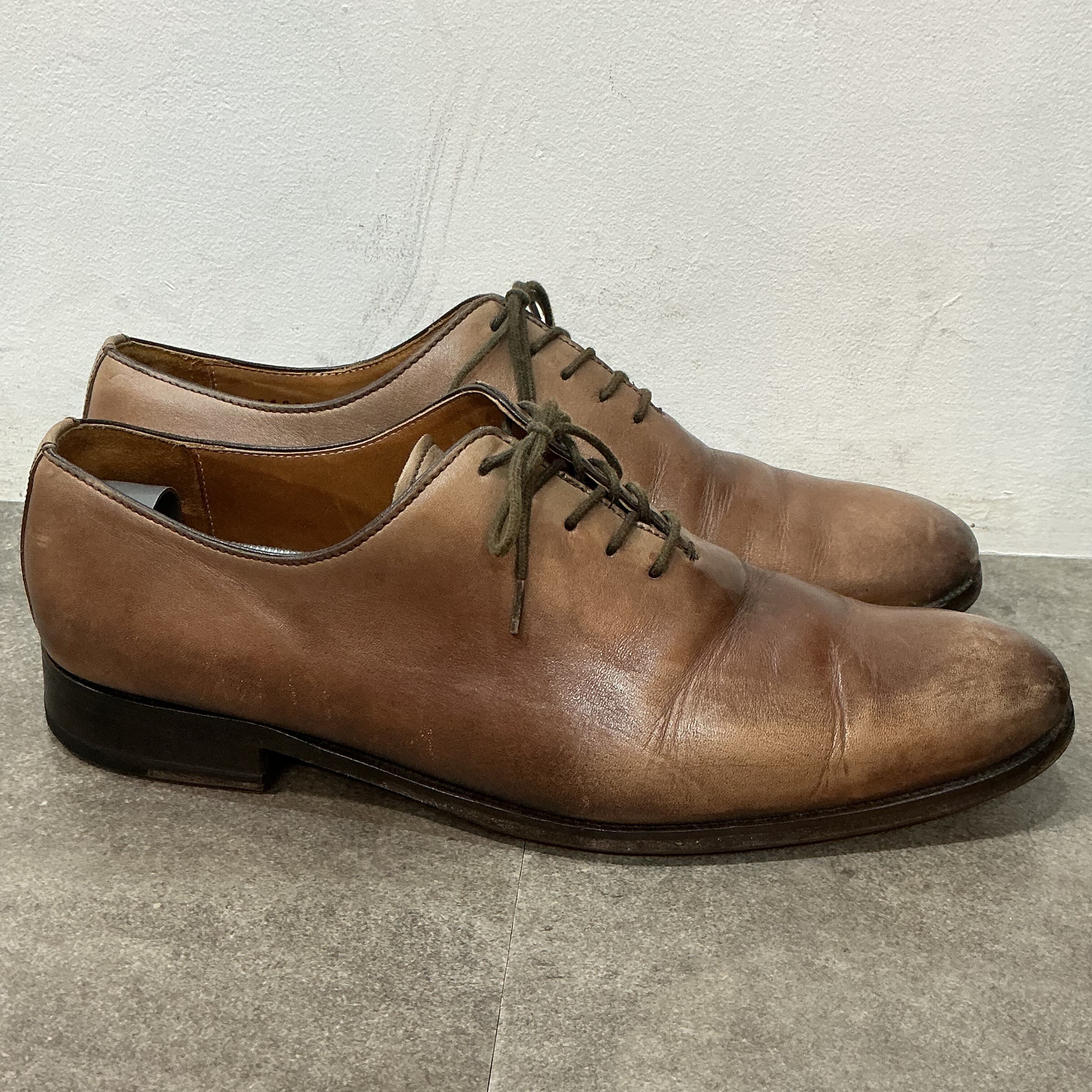 装飾のないプレーントゥでドレス寄りだが、革質と色味でややカジュアルに履ける一足です。