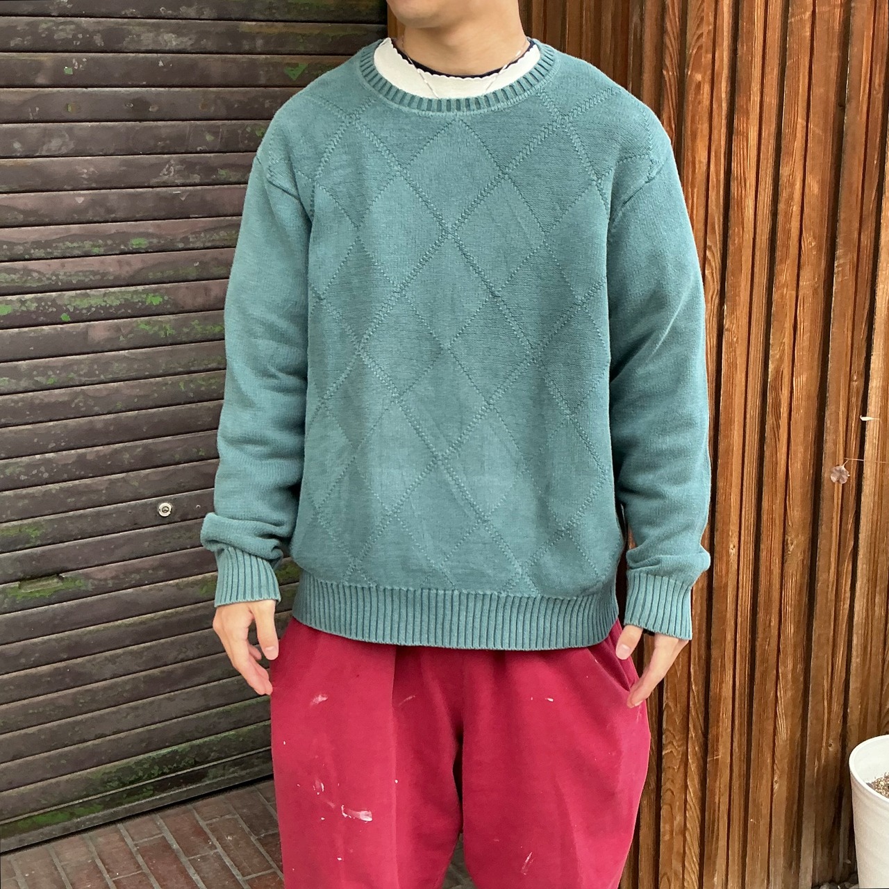 落ち着いたグリーンカラーのアーガイル編みニットになります。同色で柄を表現しているため、主張しすぎない上品なデザインとなっております。