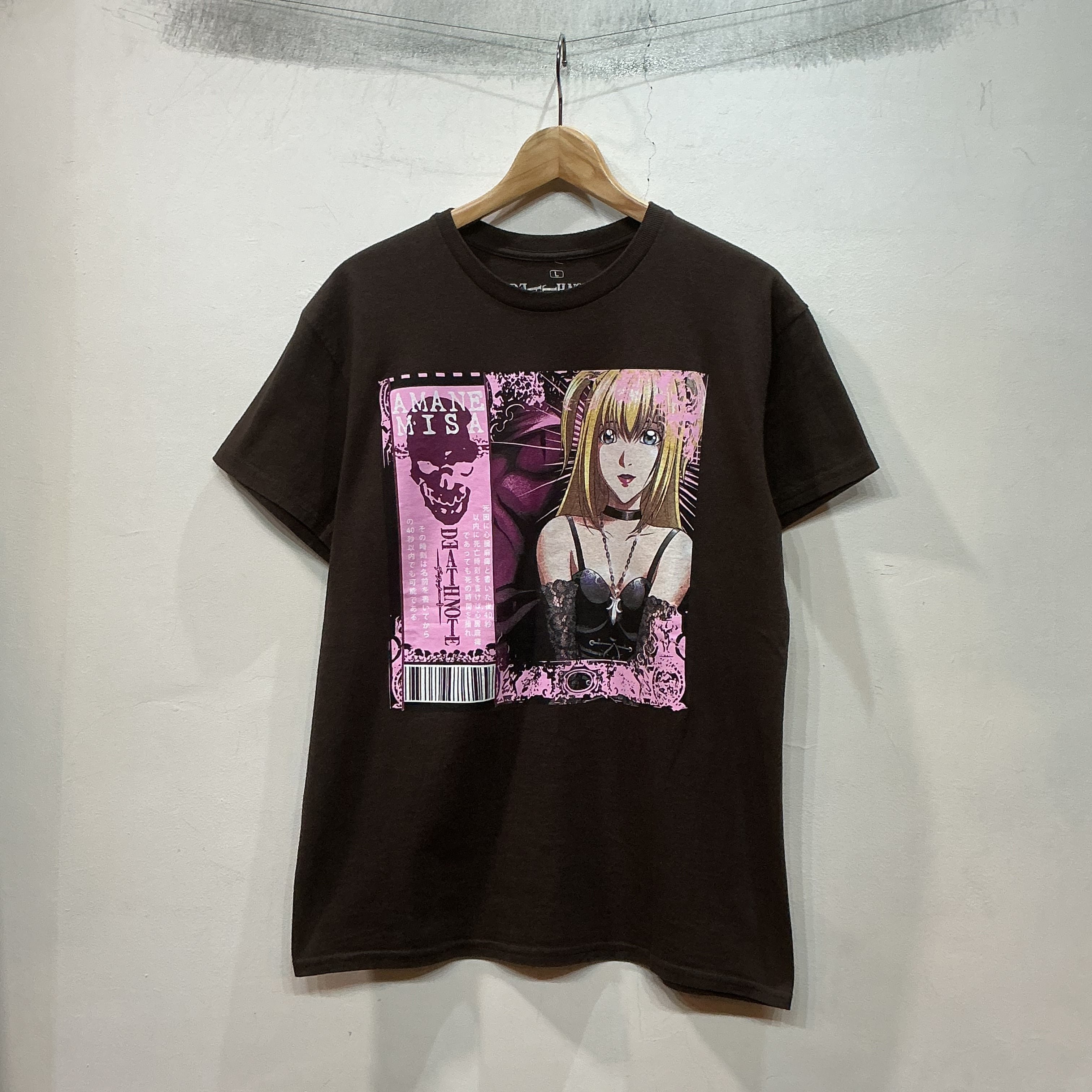 2000年代 デスノート アマネミサのアニメTシャツになります。原作のアイドル×狂気なミサのキャラ性をうまく落とし込んだデザインです。ブラウンボディーなのも○