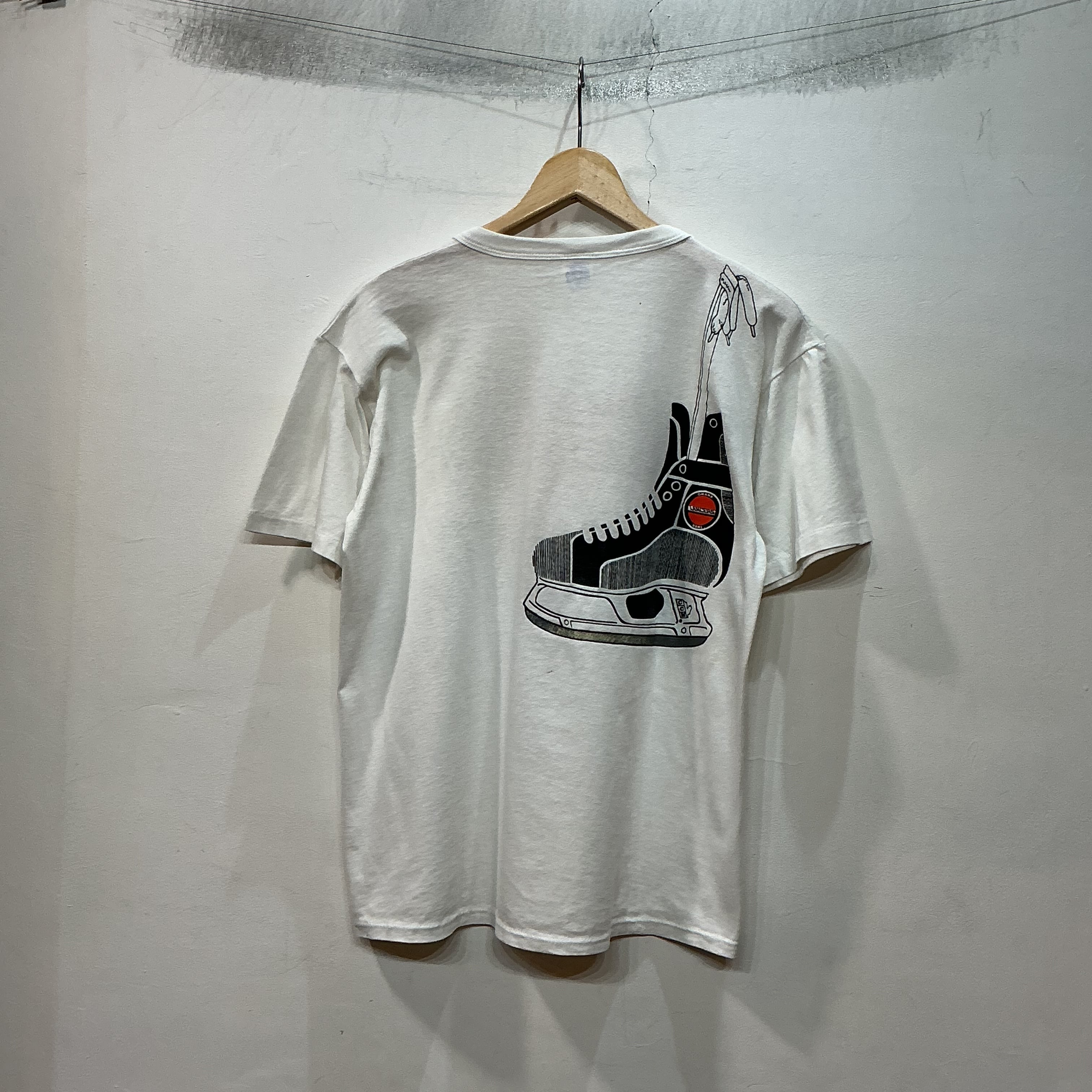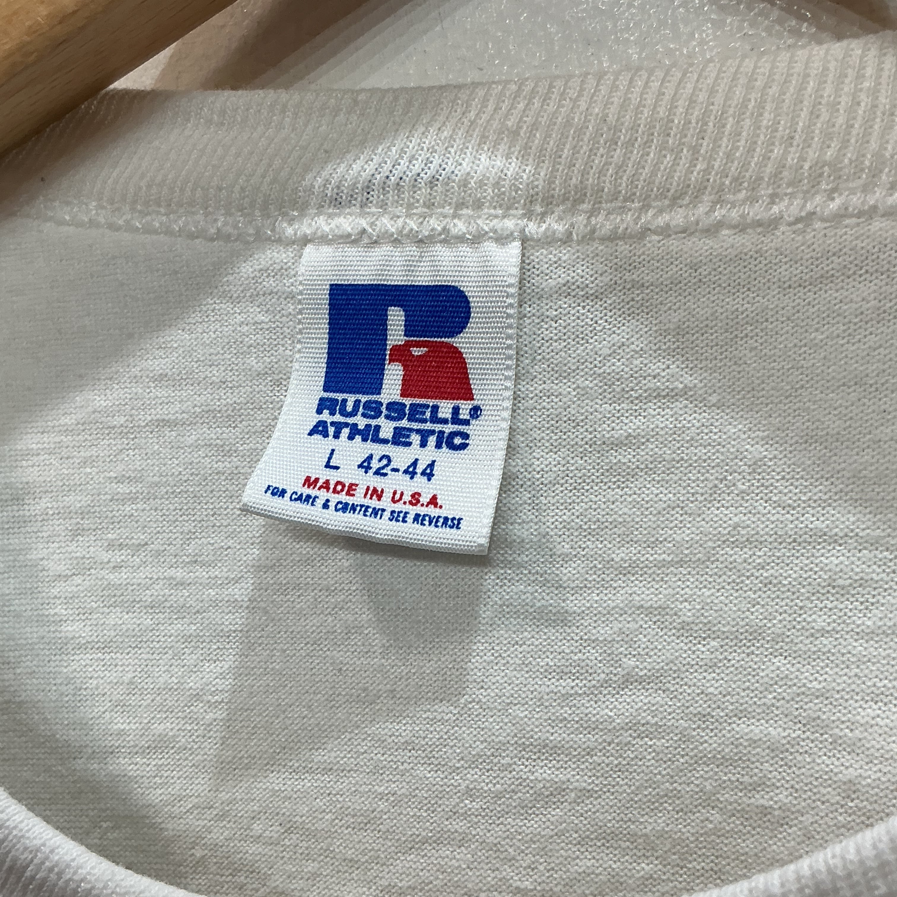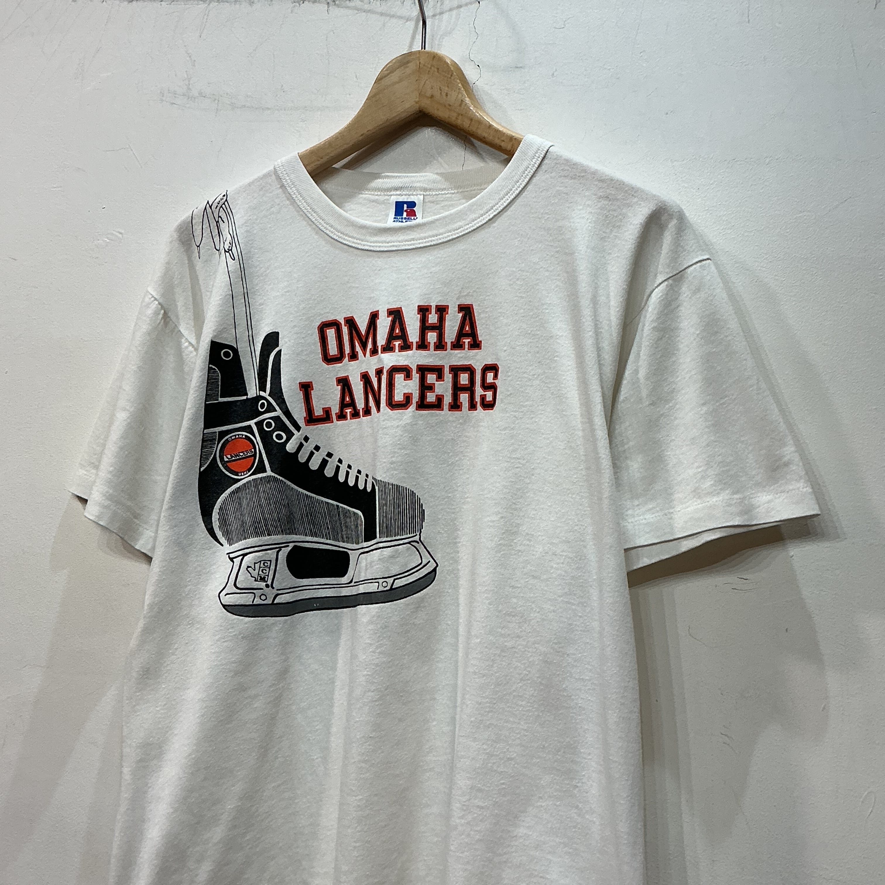 80’s USA製 Russell ラッセル Omaha Lancers オマハランサーズカレッジTシャツ 半袖Tシャツ プリントTシャツ 両面プリント 白Tシャツ スポーツ ヴィンテージ 古着 【26SST】 gr-1559